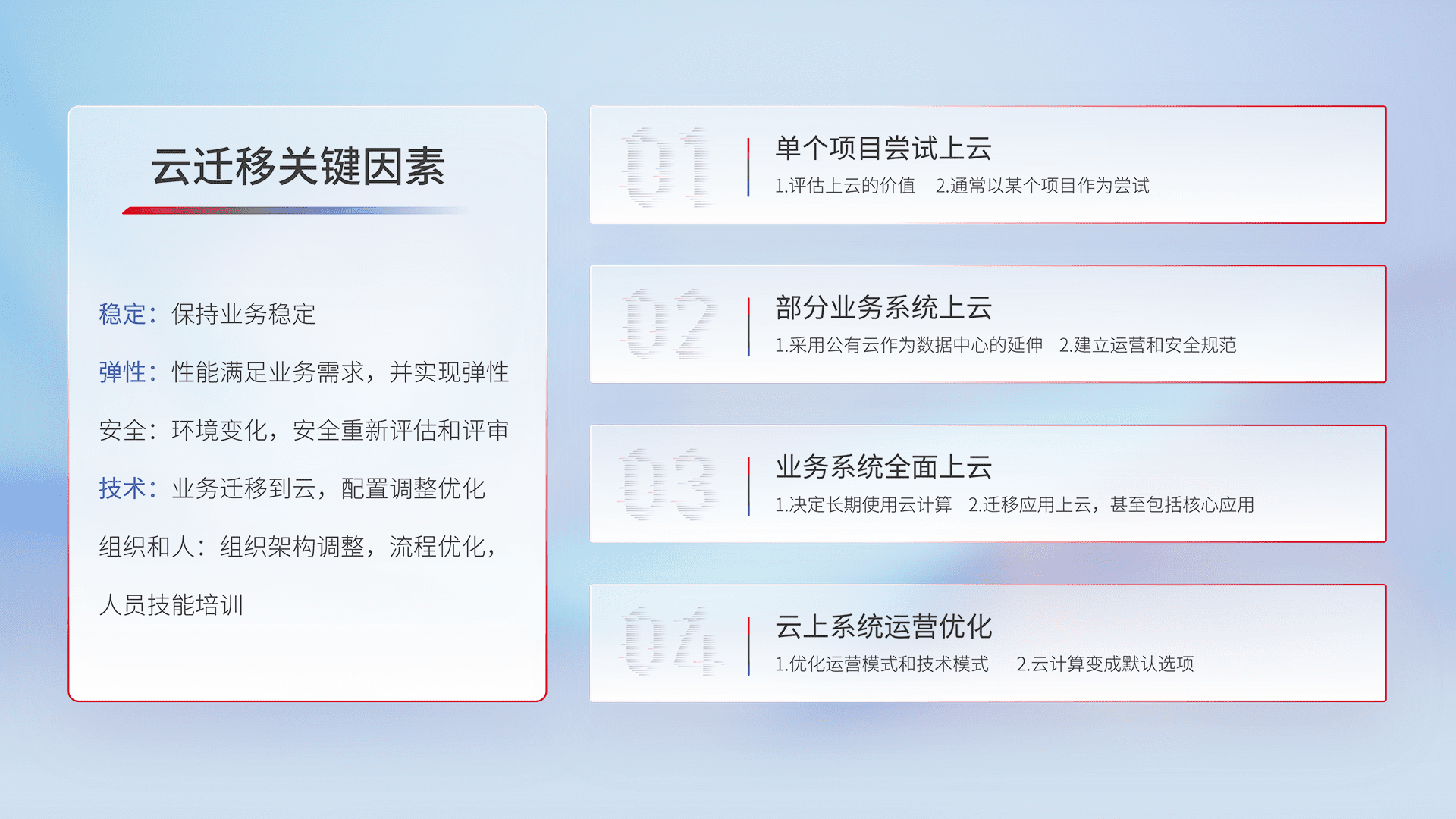 结合实际业务,,,,从规划设计、、、云平台选型、、云原生改造、、数据迁移、、集成交付,,,迁移全过程为客户识别最佳上云路径,,做好风险识别管理,,,设计网络架构、、、身份权限、、安全审计合规、、、操作审计、、、、日志审计、、监控告警策略、、多站点容灾设计等,,,对云上基础设施进行整体规划,,,提升IT治理水平,,以满足弹性、、高可用、、、、高性能的需求。。
