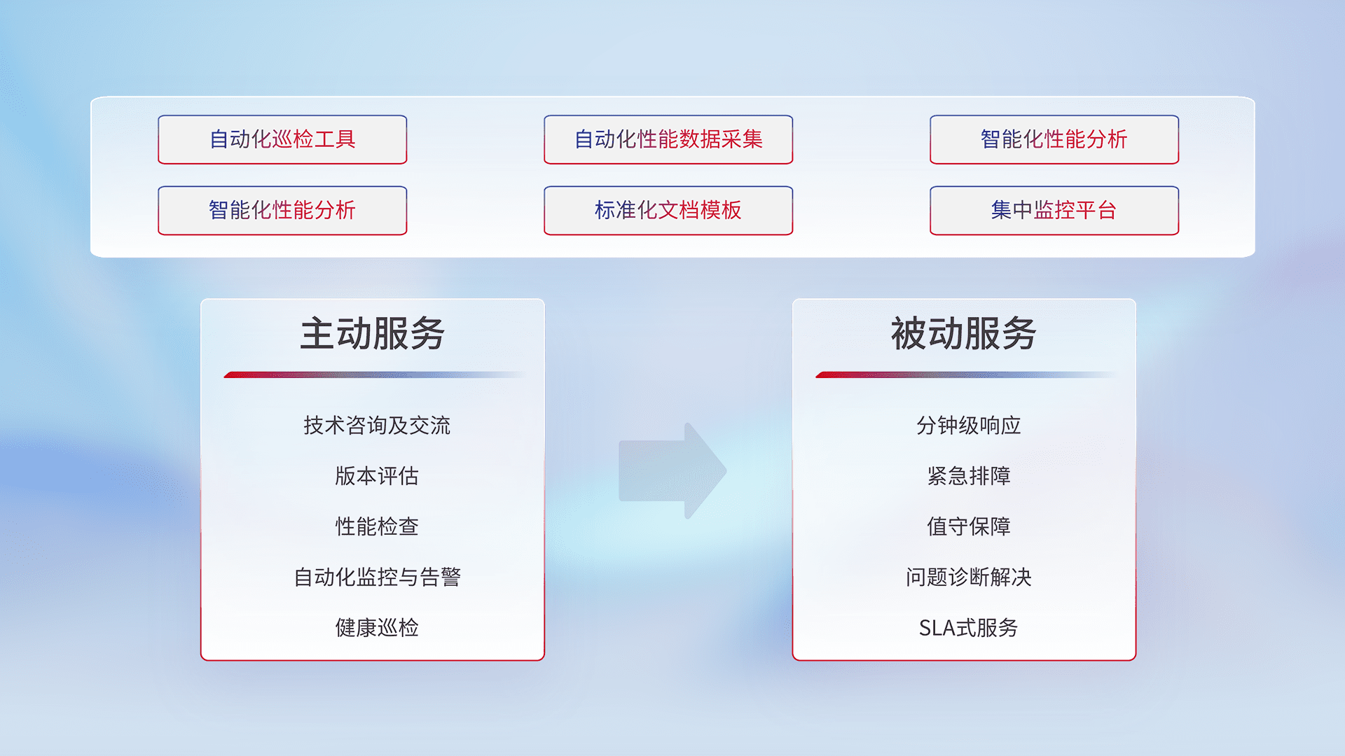 智能化工具和标准化文档,,保障服务质量,,,提供主动服务(包含技术咨询、、版本评估、、、性能检查、、自动化监控与告警、、、、健康巡检)和被动服务包含(分钟级响应、、、、紧急排障、、、值守保障、、、问题诊断解决、、、、SLA服务)。。。