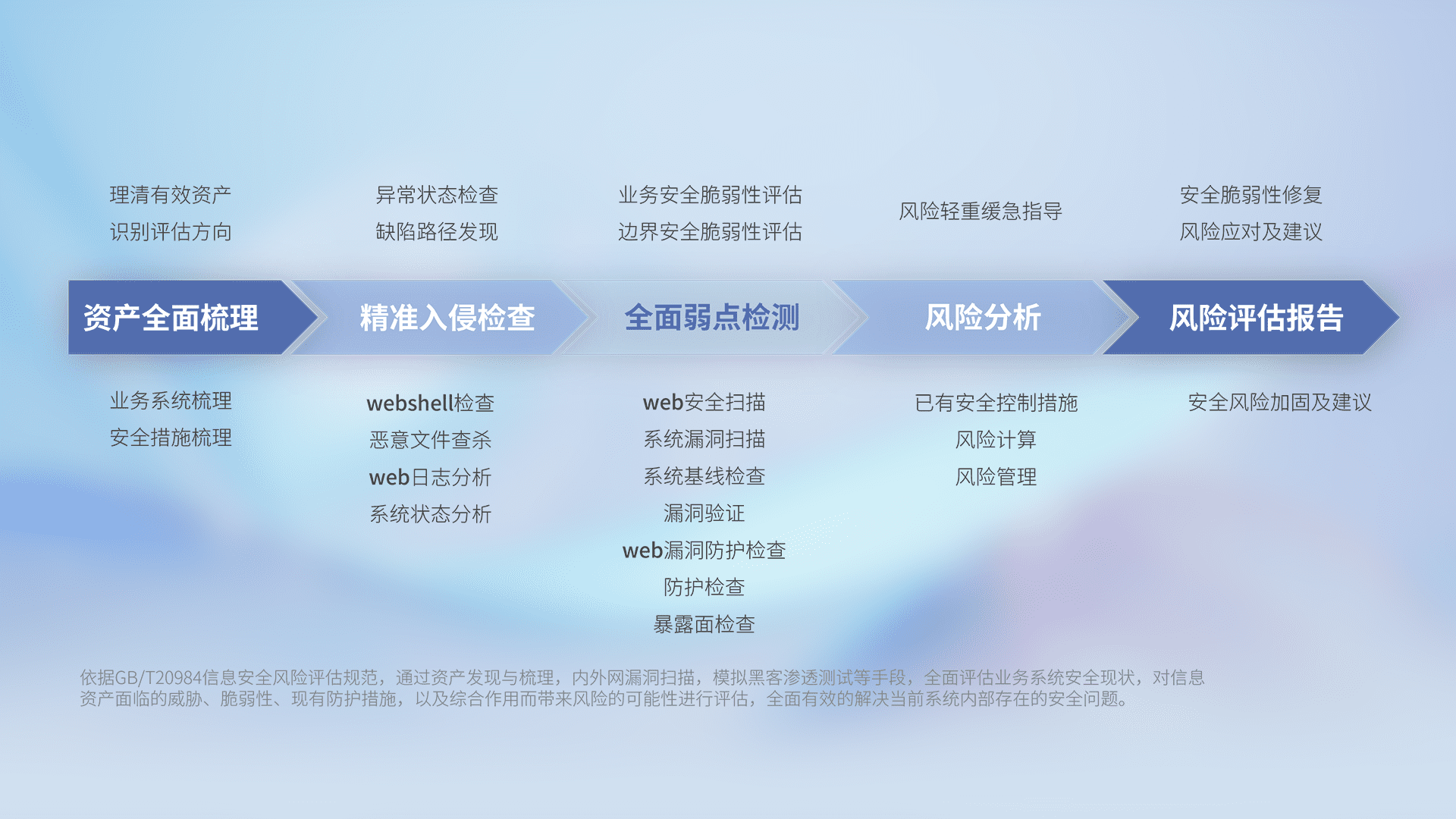 针对客户行业特性,,,以专业的安全服务+多厂商联合解决方案提供专属的一站式安全管理服务,,,帮助客户全面感知网络空间威胁,,,基于识别、、、、检测、、、、分析、、、、防护、、、、监测、、、响应的服务理论模型,,从方案咨询、、、集成交付、、、评估验证、、优化加固、、、、运维运营,,,,致力于为客户提供完整的闭环管理式安全服务。。以实战经验为客户打造高抵御风险的安全体系,,,帮助客户发现威胁、、对抗威胁、、处置威胁,,,不断积累安全对抗能力,,,持续保障数字化安全。。